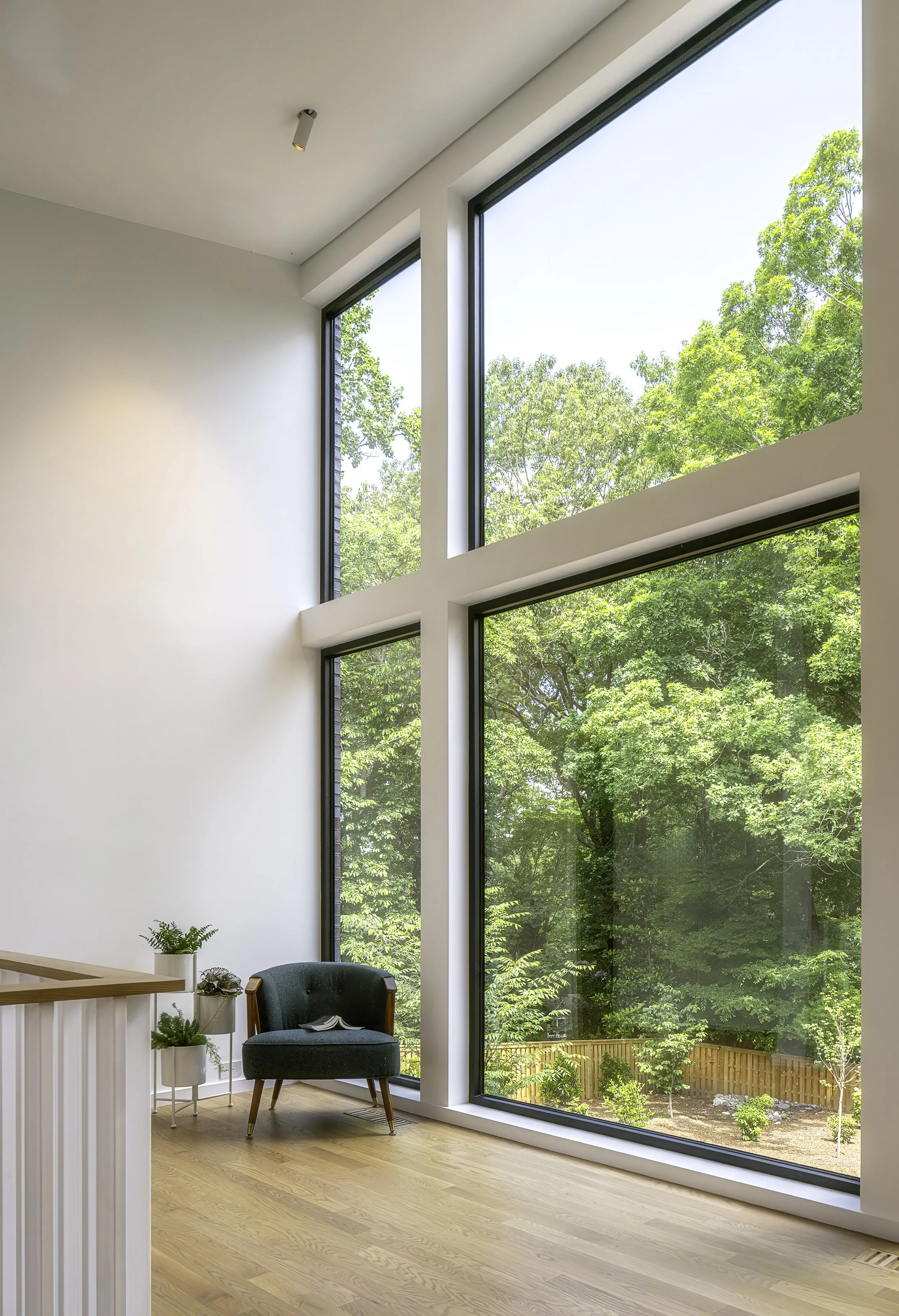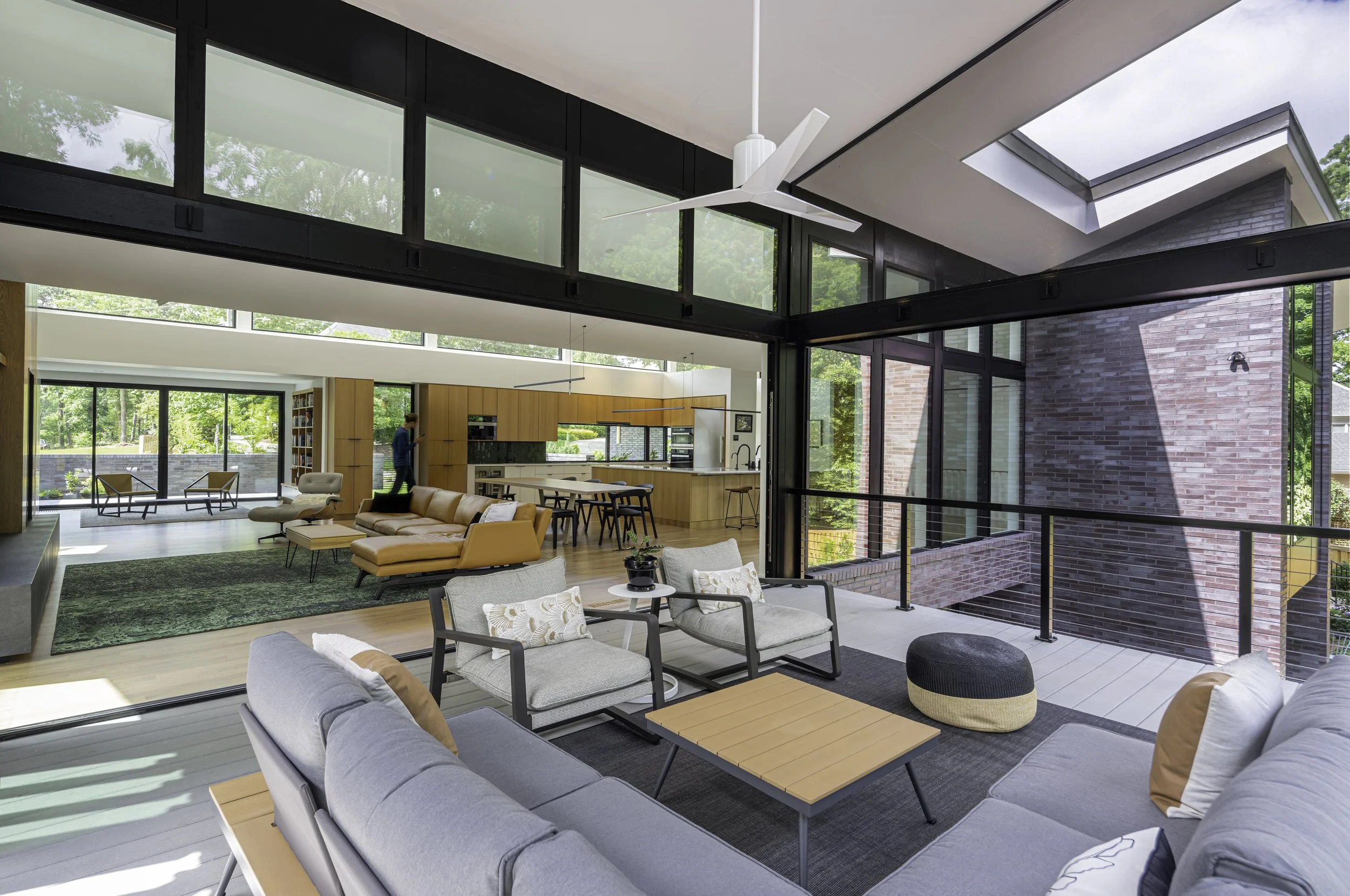 The house sits back from its quiet street, just as the neighboring houses do, and a large wooded back yard at the bottom of the sloped site is the focus of the north side of the house, which is almost entirely glass. One large open space with a roof sweeping up towards the sky in two directions is a distinctive feature of the house that lets light in and views out.